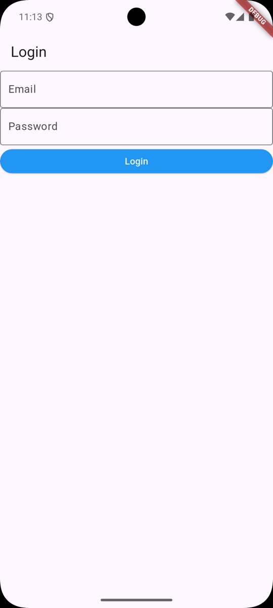 import 'package:flutter/material.dart'; void main() { runApp(MyApp());} class MyApp extends StatelessWidget { const MyApp({super.key}); @override Widget build(BuildContext context) { return MaterialApp( title: 'Welcome to Flutter', home: Scaffold( appBar: AppBar( title: Text('Login'), ), body: Column( children: <Widget>[ TextField( keyboardType: TextInputType.emailAddress, decoration: InputDecoration( border: OutlineInputBorder(), labelText: 'Email', ), ), TextField( keyboardType: TextInputType.visiblePassword, decoration: InputDecoration( border: OutlineInputBorder(), labelText: 'Password', ), ), ElevatedButton( onPressed: () { print('Login button pressed'); }, child: Text('Login'), style: ElevatedButton.styleFrom( backgroundColor: Colors.blue, foregroundColor: Colors.white, minimumSize: Size(double.infinity, 36), ), ), ], ))); }}Saving the file should automatically update the emulator with the new form: