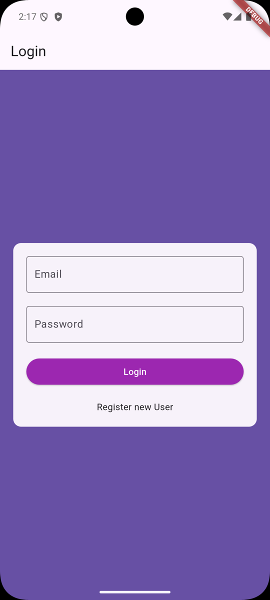 import 'package:flutter/material.dart'; class Login extends StatelessWidget { const Login({Key? key}) : super(key: key); @override Widget build(BuildContext context) { return Scaffold( appBar: AppBar( title: Text('Login'), ), body: Container( color: Theme.of(context).primaryColor, child: Column( mainAxisAlignment: MainAxisAlignment.center, children: <Widget>[ Card( elevation: 0, margin: EdgeInsets.only(left: 20, right: 20), child: Padding( padding: EdgeInsets.all(20.0), child: Column( children: <Widget>[ TextField( keyboardType: TextInputType.emailAddress, decoration: InputDecoration( border: OutlineInputBorder(), labelText: 'Email', ), ), SizedBox(height: 20), // Acts as a spacer TextField( keyboardType: TextInputType.visiblePassword, decoration: InputDecoration( border: OutlineInputBorder(), labelText: 'Password', ), ), SizedBox(height: 20), // Acts as a spacer ElevatedButton( onPressed: () { print('Login button pressed'); }, child: Text('Login'), style: ElevatedButton.styleFrom( backgroundColor: Colors.purple, foregroundColor: Colors.white, minimumSize: Size(double.infinity, 40), ), ), Padding( /// padding: EdgeInsets.only(top: 20), // Different way to add padding child: InkWell( child: Text('Register new User'), onTap: () => Navigator.pushNamed(context, '/register') ), )/// ], ), ), ) ], ))); }}Once that is done, we can import the Login class into lib/main.dart and use it. But first, let's create a new file for our Registration page.